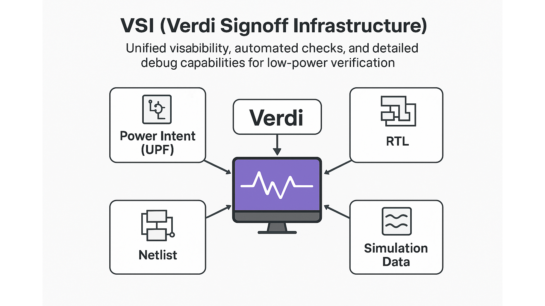 VSI (Verdi Signoff Infrastructure) is a structured, signoff-driven verification methodology built around Synopsys Verdi. It provides unified visibility, automated checks, and detailed debug capabilities for low-power verification.